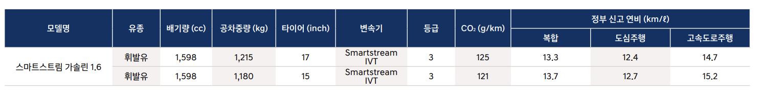 | 전 고 (mm) | 1,565(15인치 타이어) / 1,535(17인치 타이어) |